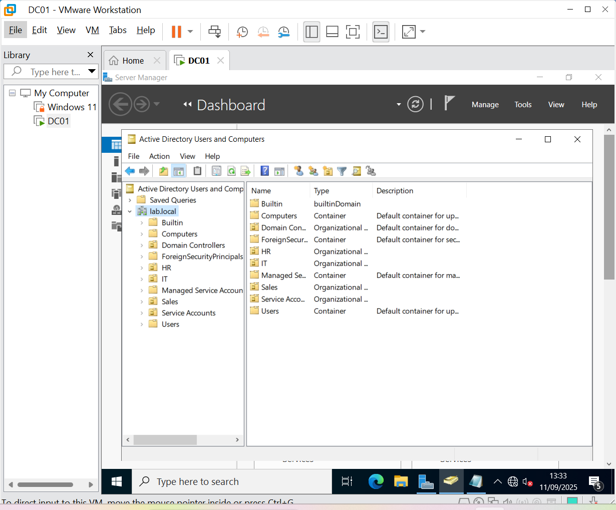 This project showcases my hands-on experience setting up an Active Directory (AD) environment in a VMware homelab.